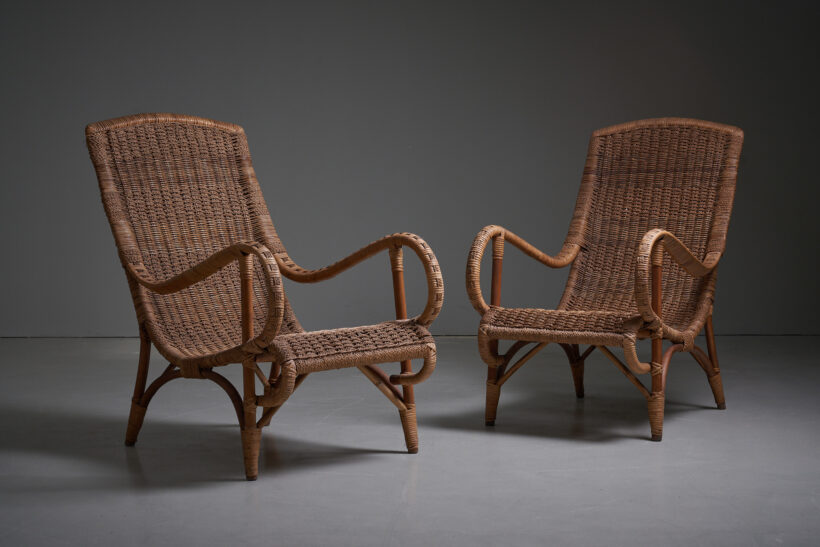 A rare pair of rattan chairs. Comfortable and with very beautiful details. Italy 1930’s.
