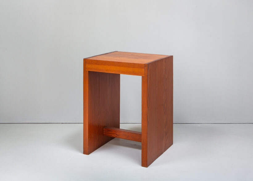 The (five benches), the console table (and the wooden bench) where standing in the “alcove” that served as the entrance to the actual chapel of the St-Lievenscollege in Gent, Belgium. This building was designed and build by Marc Dessauvage between 1964 and 1965. All furniture was designed and produced in his typical “arte povera” style and installed in 1965. The benches are made of solid pine with plywood inlay. The console and the sculptural bench where realised in solid Norwegian red pinewood. The chapel and its alcove are one of his first completed works of his 20 year career as an architect. Marc Dessauvage is one of the pioneers of Belgian Brutalism. One bench has been “restored”, four others left untouched.