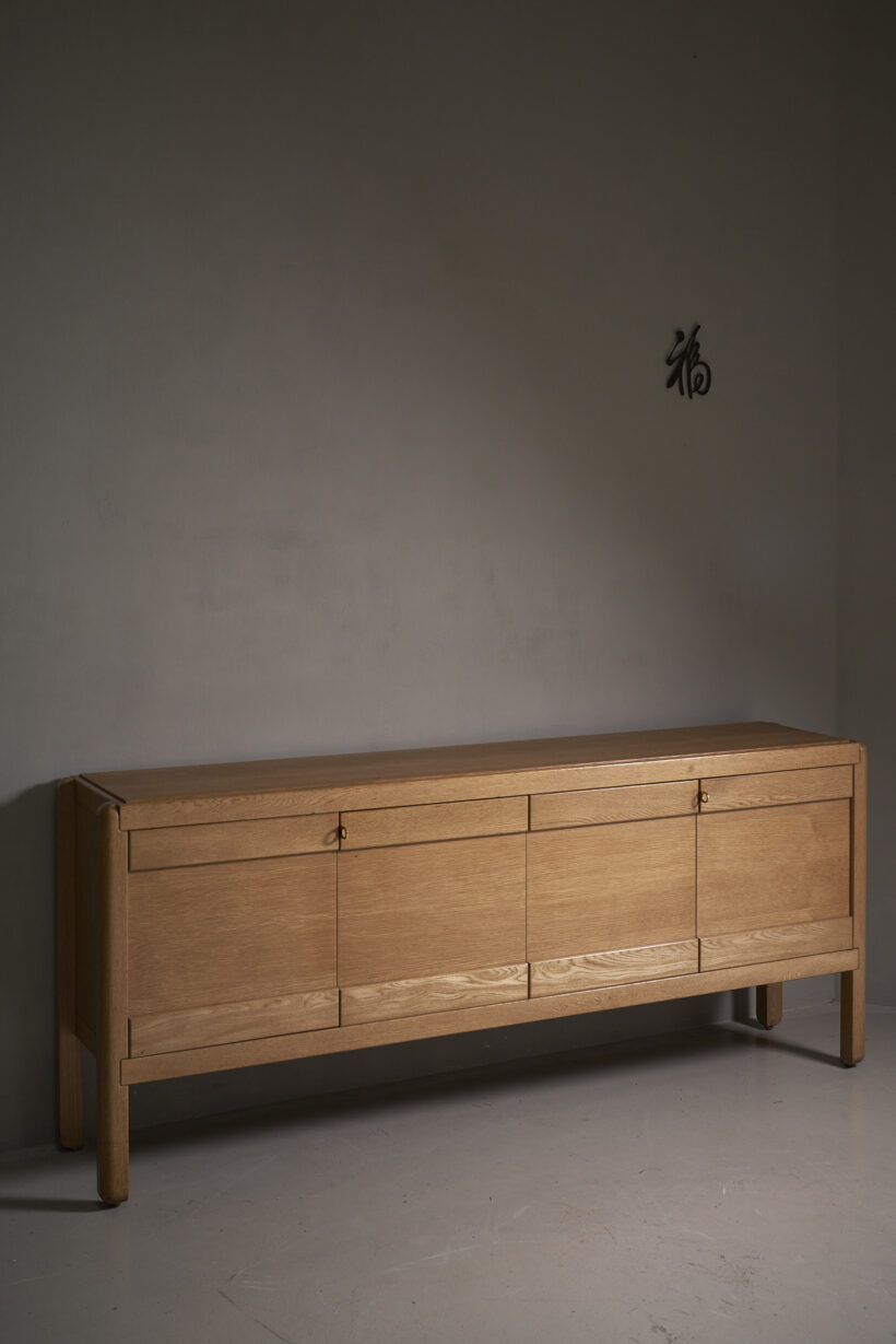 Elegant and high qualitative oak sideboard on legs with brass handles. Very good condition with small traces of use.