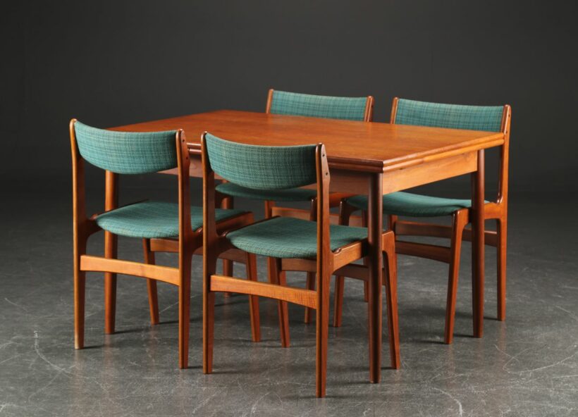Elegant dining table veneered with teak by a Danish furniture producer. Furthermore, four chairs made of teak, back and seat with wool fabric, produced by Farstrup, marked accordingly.