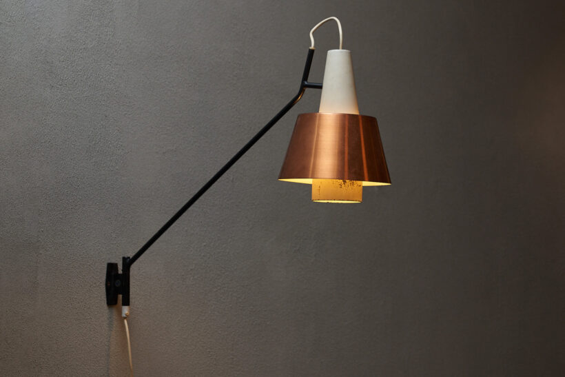 Modernist wall lamp with swing arm and copper lampshade. Made in Sweden and edited by Luco, 1970.