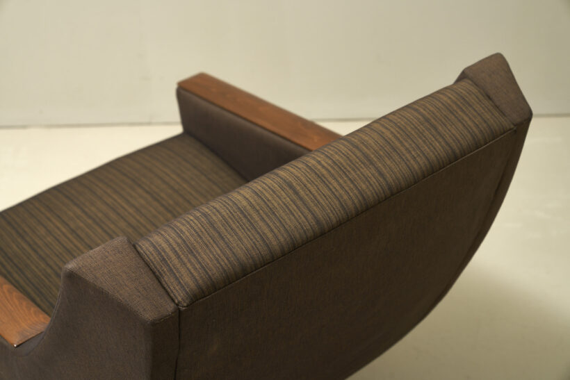 Swivel easy chairs with wooden armrests and a chrome plated cross foot. The chairs have their original brown fabric and are in a good condition according to their age.